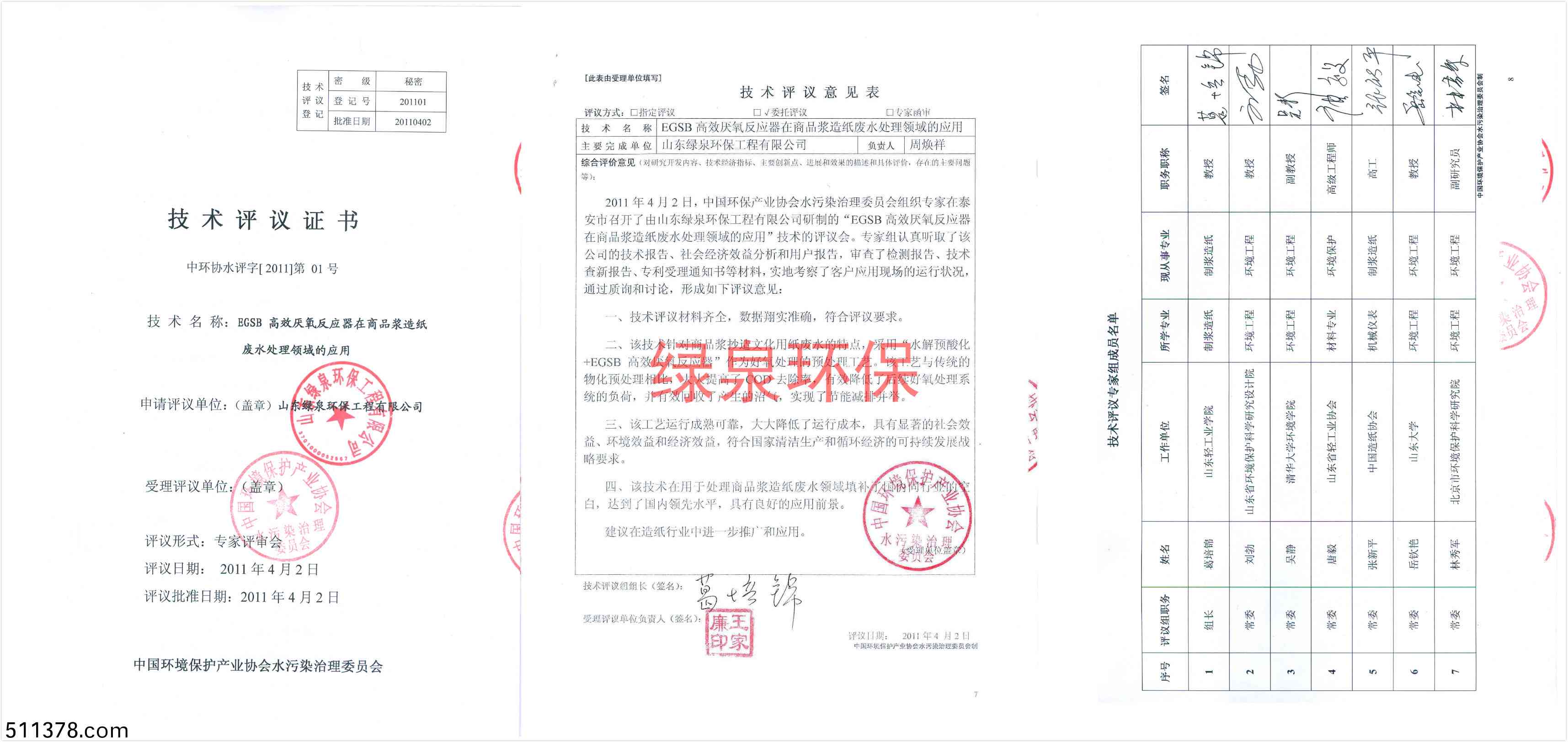 高(gao)傚(xiao)厭氧反(fan)應(yīng)(ying)器在商品(pin)將(jiang)造(zao)紙廢水(shui)處(chu)理領(lǐng)(ling)域的(de)應(yīng)(ying)用技(ji)術(shù)評議證(zheng)書(shu)